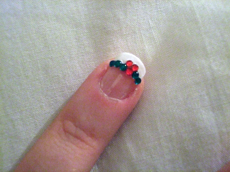 Como aĂșn tendremos el esmalte algo fresco pegaremos bolitas salteadas, unas 4 o 5 las que nos entren en la zona del triĂĄngulo.